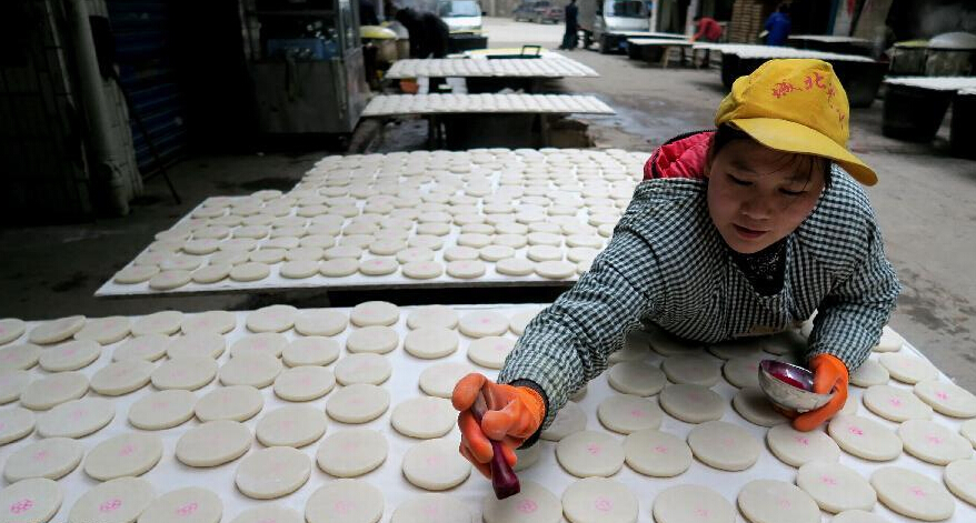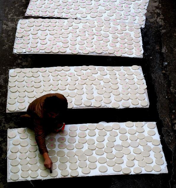 以上の画像では、地元の人はお餅の上に赤い花の判子を押しています。