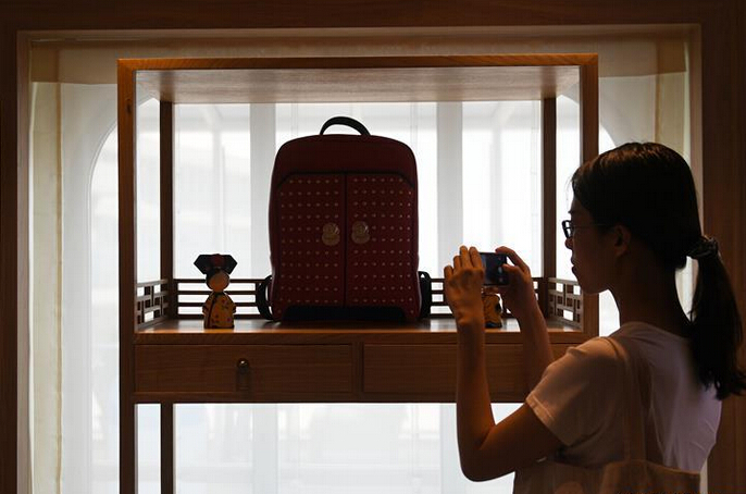 「海洋賛礼号」で故宮文化創作展示品を興味津々に見物している女性