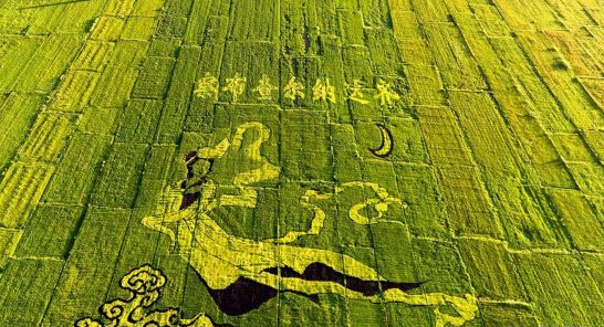 この巨大稲田絵は面積が650ムーもあり、「飛天」、「浪」、「鮫」などの図によって組み合わせられ、色彩稲によって出来ているということです。(人民ネットより)