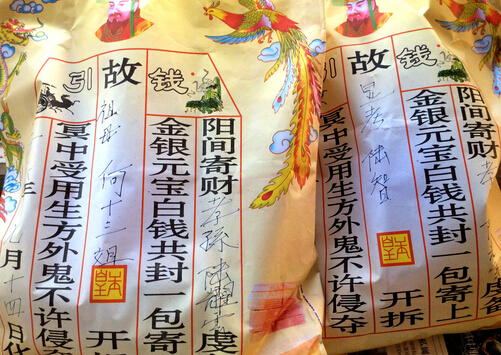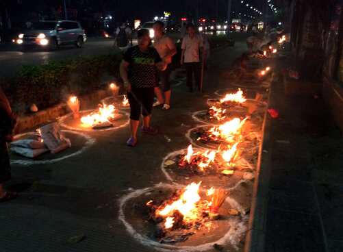 日が暮れた後、道端で石灰の粉で輪をいくつか描いて(関係ない鬼が供え物を奪えないように)、冥紙と紙で作った金、銀と衣類、靴と帽子などを入れた封筒(祭り専用、上に差出人と受取人の名前が書かれている)を輪の中に置いておきます。蝋燭と線香を燃やしてから、「よろしくお願いします」と言いながら、郵便配達人に感謝するための金銀を燃やします。祖先に冥紙を燃やす時、よく「どうぞ、思う存分に使ってください。来年また送りますから」というような話をします。完全に燃やし尽さないなら冥界に届いたものがボロボロな物になるので、終わる前に丁寧にチエックしなければなりません。最後は爆竹を鳴らして、終わるのです。