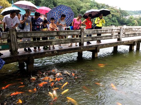 家族で西湖に船を浮かべて、ゆっくりすることもよろしいですが、何よりも楽しいのは錦鯉に餌をやることです。観光客が餌を投げ出すと、大勢の鯉は先を争って、餌を奪って、激しい音を立てました。鯉も人間社会と同じく競争が厳しいなと感慨深かったです。