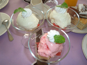 ホテルへ行く途中は暑くてたまらなかったのですが、一歩ホテルに入ると別世界、「うわぁ~、涼しい!」って思わず声を上げてしまいました。スタッフが笑顔で、「二階のレストランへどうぞ」と席まで案内してくれました。フロアーにグランドピアノが置いてあり、音楽好きな私は「弾けたら、弾いてみたいのに・・・」と思いました。豊富な種類の洋菓子がお皿に綺麗に並べてありました。特に気に入ったのは「日式涼粉(フルーツポンチ)」でした。お豆腐のように柔らかく透明な物と、幾種類もの果物が細かく切って入れられています。トッピングは緑色の薄荷です。ちょっとしたものですが、とてもよく作られていると思いました。またコーヒーやジュース、お茶なども飲み放題で、そのサービスのよさに目を見張るばかりでした。その他、イチゴアイス、マンゴーアイス、バニラアイスの注文もできます。静かに心地よく流れてくる音楽を聴きながら、知らず知らずのうちに半日も過ごしてしまいました。ゆっくりと過ごすには、よい場所だと思います。