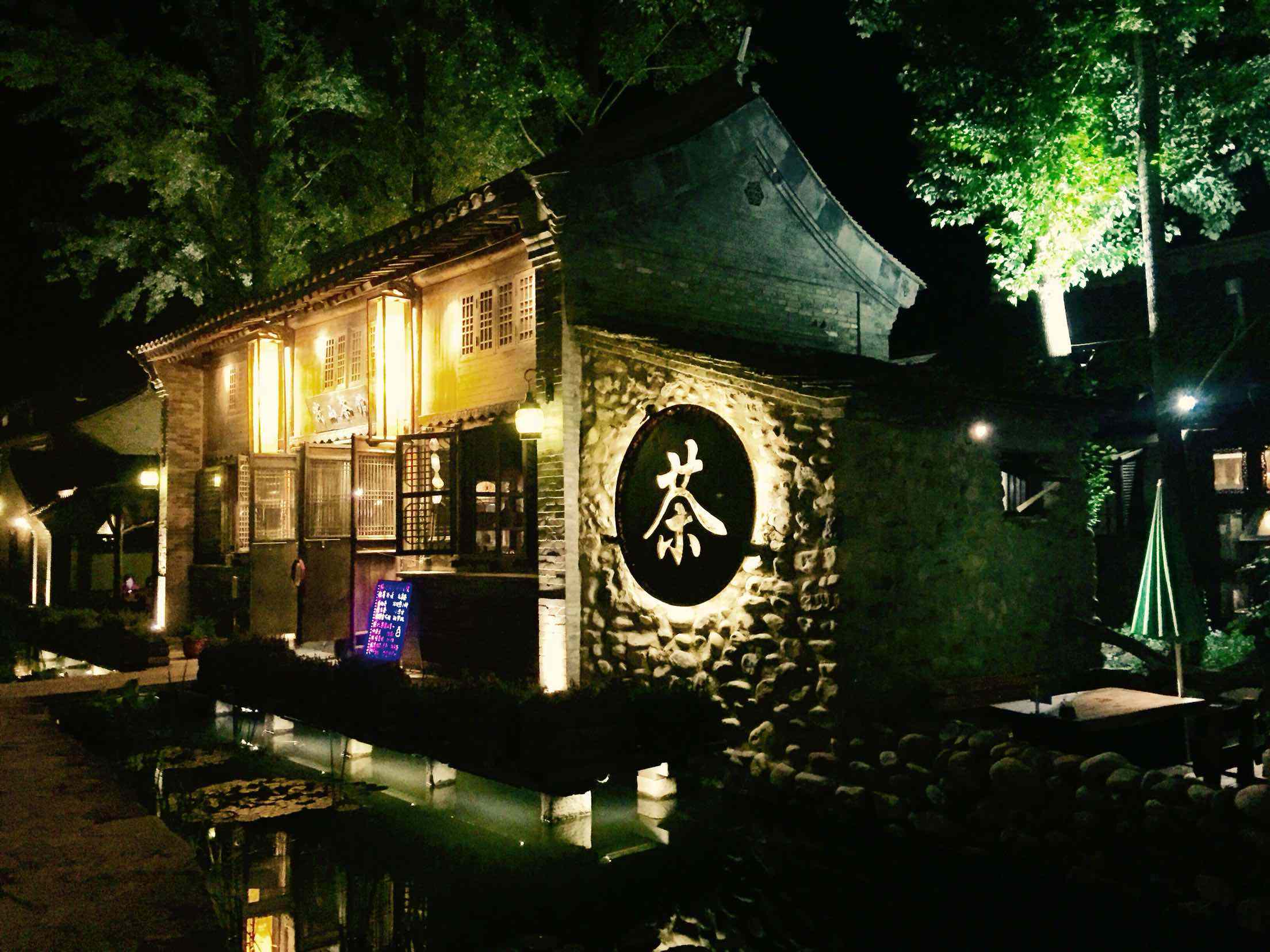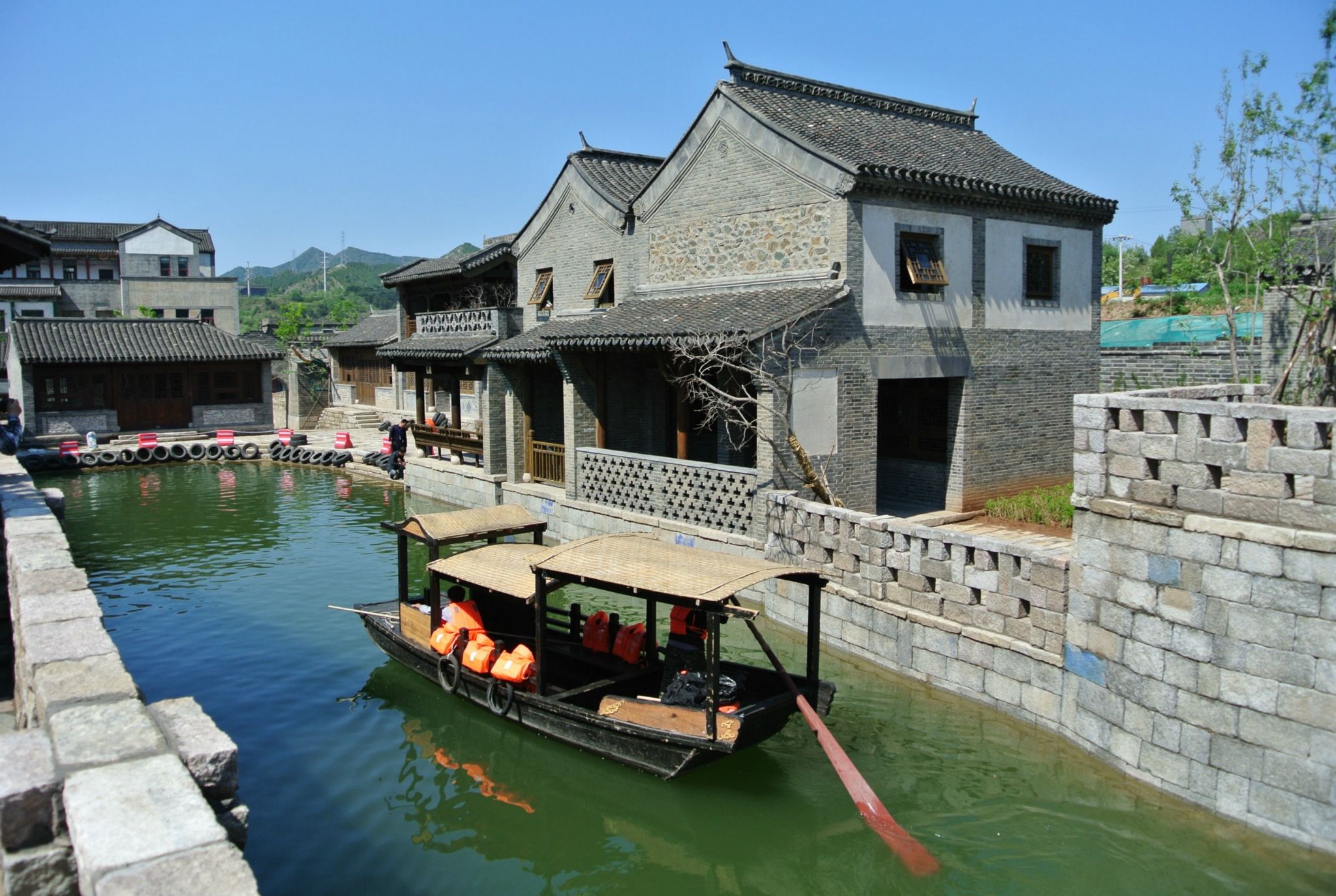水鎮の建築は北方民国時代の古鎮の風貌を保ちながら、江南の風情が漂っています。人工川に鴛鴦湖から水が流れ、いくつかの小舟が水面に浮き上がっています。山々に囲まれ、頭を上げて望めてみると、長城はまるで巨竜のように山脈の上に身をおいています。なかなか良いレジャースポットですね。