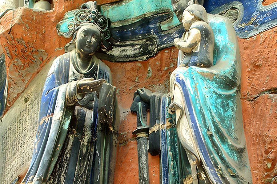 大足市街の北部にある公園。公園内には北山摩崖造像と呼ばれる石刻があるが、その入口は北山公園を入って石段を30分ほど上がった所。 約500mの長廊には日月観音、西方極楽世界、水月観音など仏教をモチーフにした石刻が続く。これは唐の892年から250年あまりの歳月をかけて刻まれたもので、約300の石窟に1万体以上が彫られている。宝頂山の石刻に比べて、繊細で荘厳な感じを受ける。