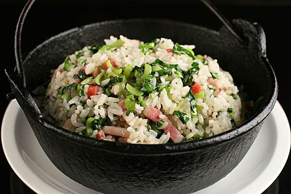 もち米の甘い香りもあり、ベーコンの薫りもあります。社菜のすがすがしい香りもあって、ご飯に入ると、香りがあふれて、食欲が湧いてきます。