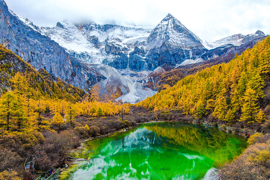四川省甘孜チベット族自治州南部、横断山脈の中段、青蔵高原の東に位置し、「最後のシャングリラ」「地球で最後の極楽浄土」と讃えられ、中国国内の自然保護区に指定されています。亜丁はチベットの言葉で「太陽に向かう処」すなわち聖地とされ、海抜2990m(貢嘎河口)から6032m(仙乃日峰)に面積1334?の広大な景観が広がっています。また中国で最も無開発な高山自然生態システムが残っており、シャングリラ地区の景勝地の代表として世界で最も美しい高山峡谷景観と称賛されています。そして亜丁景勝地には高山動物と森林動物を中心として野生の動物が200種以上生息しており、南方系種としてレッサーパンダやジャコウジカ、赤鹿、ターキンなど、北方系種としてオオカミやオオヤマネコ、青羊などがいます。