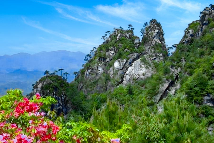 龍勝花坪保護区は「花の王国」とも呼ばれ、年中様々な花が咲いて、止まることはありません。春は、迎春花、桜、椿、桐、桃の花、躑躅などが咲き乱れます。夏は、南天、百合、スカイズラなどが次第に咲き始めます。秋は、野菊、木犀、夾竹桃、紫陽花が咲き誇ります。冬になると、蠟梅、山枇杷、油茶の木などが冬の寒さに耐えながら、力強く咲いています。特に「花の王様」と呼ばれた躑躅の花は10種類以上もあり、保護区の一大家族と称えられ、それまでの植物の資料には記載されていないので、見つけた人の名前が命名されます。毎年、春先になり、一足先に咲く紫色の躑躅が開花の号令を発するように、赤、黄色、そして白というふうに開花のローテーションを持っています。これらの躑躅の花が満開の時期になると、かすかな炎が灯るように保護区の山一面に花が広がり、どこからともなく漂ってくる景観が春から夏にかけての保護区のライトモチーフを奏でるのです。