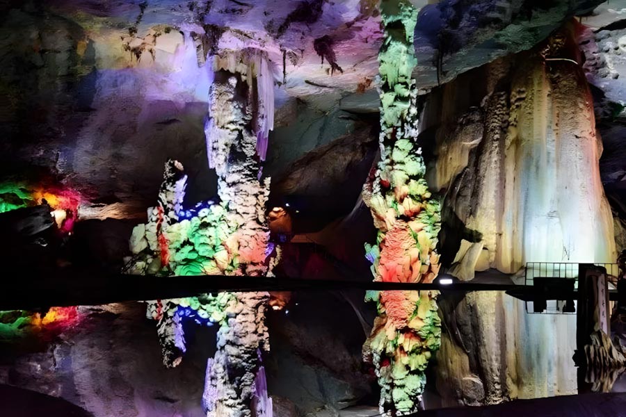 世記氷川大溶洞は桂林市から53km、興安県から4㎞離れた所にあり、約1.5㎞の観光遊覧コースが整備された鍾乳洞です。今まで桂林で開発された鍾乳洞の中でも、特別な趣向が凝らされており、大桂林の観光圏内で大の人気を誇ります。遊覧コースは陸路と水路の二つに分かれており、コース内にはライトアップされ色鮮やかな景色が続き、幻想的なムードを作り出しています。そして、撮影ポイントとされる景観が30か所ほどあり、順に氷河世界、氷山の雪蓮花、西施の寝室、化粧の美女、九天の銀河、高山流水、千年の銀杏、霊験を表す布袋、海底の竜宮、生命の源、吉祥の明珠などが挙げられます。特に霊験を表す布袋、海底の竜宮、生命の源、吉祥の明珠の四つのポイントは、世記氷川大溶洞を代表する宝物と言われ、観光客を驚嘆させています。
