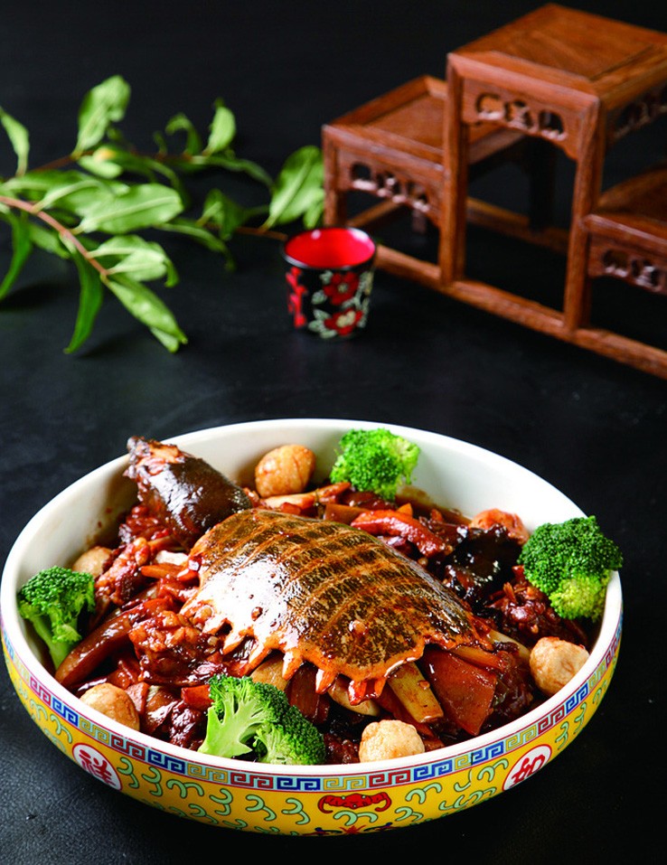 桂林現地で取り立てのすっぽんを使い、生くささが完全になくんるように水煮し、それから塩、醤油や香辛料などを入れ煮込みます。出来あがったスープが少し赤みが付き、香りが漂う非常に栄養価値の高い一品です。