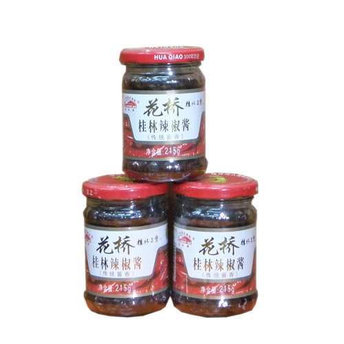 次に、桂林の唐辛子味噌は、桂林の海抜600メートルもある龍勝県辺りで厳選された唐辛子を粉切りにし、おろした大蒜と発酵させた大豆を具材にし、三花酒と塩を入れ密封した甕で何ヶ月発酵させて出来上がりです。大蒜おろし唐辛子味噌と豆豉(大豆発酵唐辛子味噌)味噌の二種類があります。どの味噌も一度口に入れると辛さの中に微かな甘みと旨みが広がり、食欲をそそる絶好の調味料です。また、外観が赤で見た目も綺麗です。桂林の「花橋」マークの唐辛子味噌が一般的に高く評価されています。