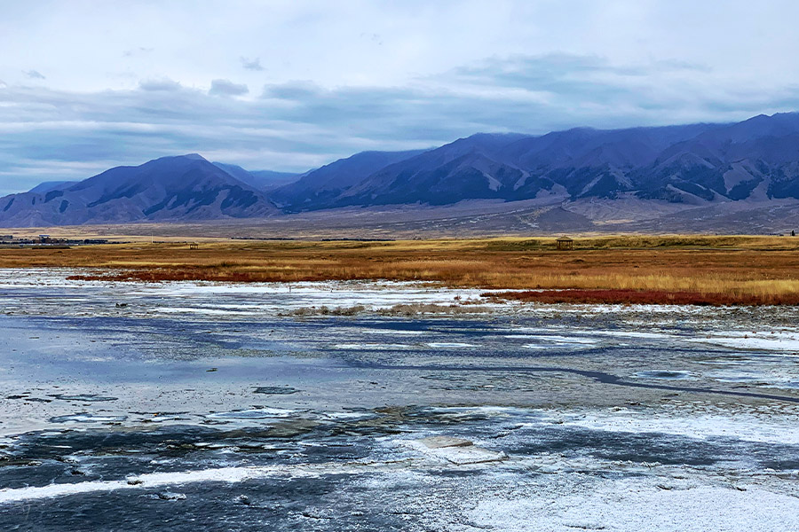 バリコン(巴里坤)湖はバリコン草原中心の低地にあり、かつては蒲類海と呼ばれ班超の将軍が活躍した地として知られています。湖面の海抜は1585m、周囲を天山山脈に囲まれ、峰々の雪解け水によってできた大小合わせて12の川がバリコン湖に流れ込み、東西12㎞、南北20㎞、総面積約113?の巨大な高山湿地湖を作り出しました。