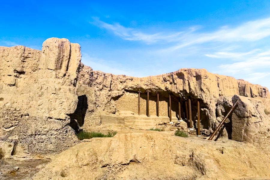 ラプチェック古城の規模は南北500m、東西300mで白楊河を挟んで南城と北城に分かれ、全体が漢字の「呂」の字形を呈していています。北城の城壁は下部を土を突き固めた版築工法で、上部は干し煉瓦で構築され、西端に角楼が立ち「馬面」という張出部の遺構が残されています。南城の構造は特徴的で、二重に築かれた構造の外部は版築で内部は干し煉瓦で建造されています。城壁は各時代の王朝により増築、補強を繰り返し造られたものと考えられています。