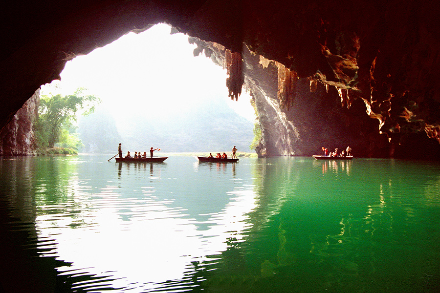 左の洞は奥行き500mで、曲がりくねって白熊洞の一つと通じています。深く穏やかな地下水は清らかで鏡のようで、広さが10~40mほどあります。舟で入口から約300m進むと水面から30m離れるところに丸い天窓があり、山腹から透き通った太陽の光が水面を照らし、反射された光は舞台上を輝かせるライトアップのようです。