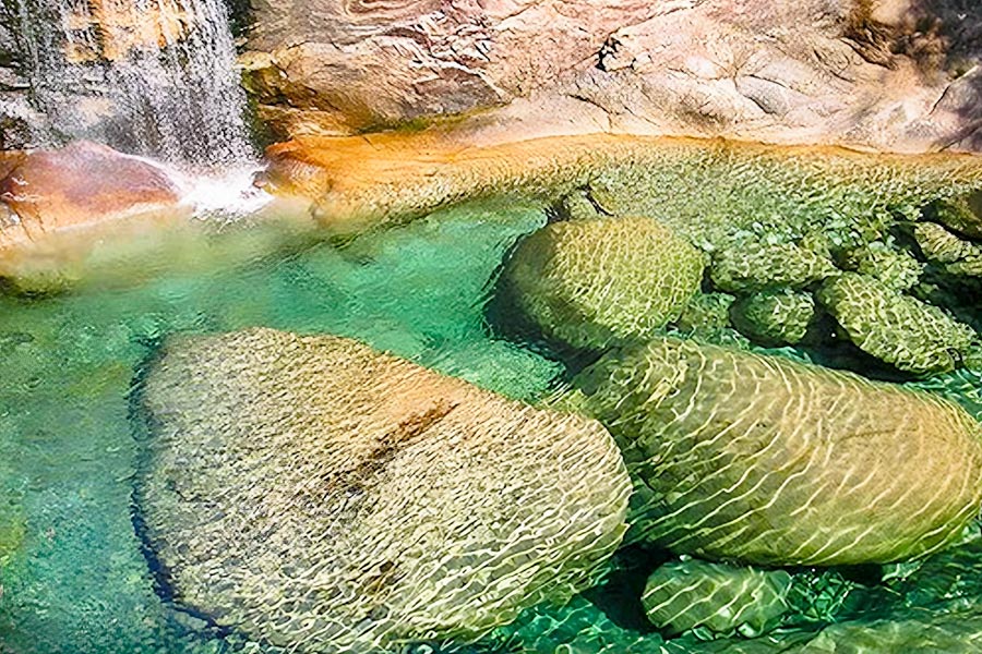 翡翠谷景区は黄山の東部にあり、別名“情人谷”といい、水源は練丹峰、始信峰から出ており、観光客が訪れることができるエリアは6000メートルに渡る。これらの池は、形は様々で、深さも様々で、水は澄み切って透明で、両側の山々が映りまるで青く輝く玉のようだ。池の底の岩石は色とりどりで美しく、池の色も無限に変化する。中でも有名な池は、竜鳳池、花鏡池、緑珠池、玉環池、白鹿池、雷雨池、天池、天鵝池などがある。映画《グリーン・デスティニー》の撮影がここで行われたことでも有名である。