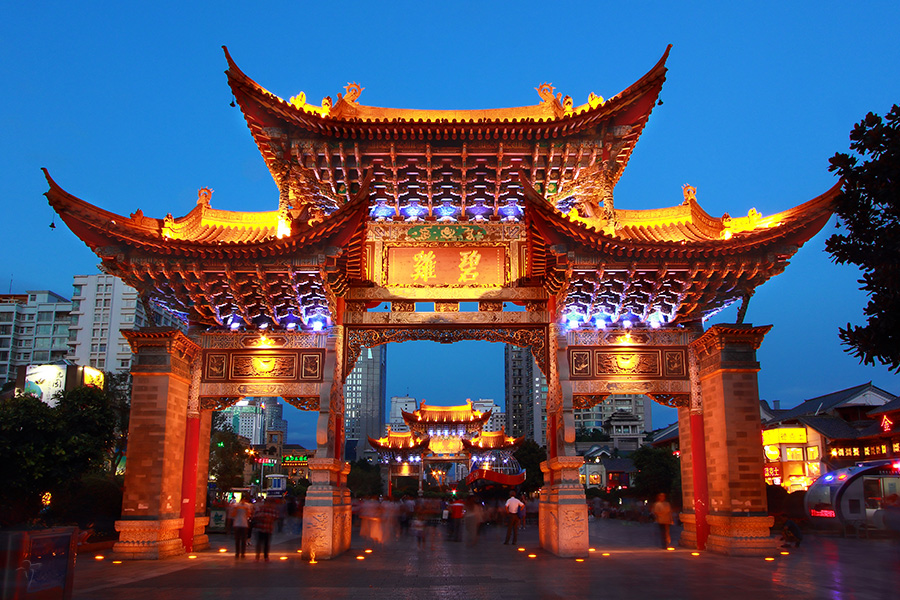 金馬碧鶏坊は明の宣徳時代に創建され、年近い歴史がある。それは昆明伝統の中心線南端の金碧路と市街の交差点に位置し、高さは12メートル、幅は18メートルで、彫刻の絵棟があります。東坊は金馬山に隣接し、金馬坊と命名されました。西坊は碧鶏山によって、碧鶏坊と名づけられました。数十メートルの距離にあり、壮大で美しいのです。ここは昆明の中心であり、商業地区でもあり、三市街、南屏街と正義路は若者がここに集まり楽しむ場所です。特に金馬碧鶏坊と隣接する他の街も特色があります。