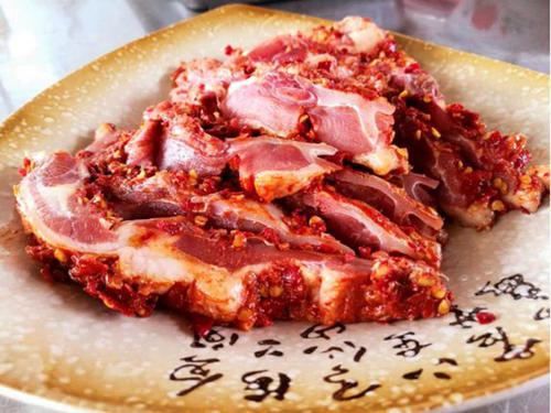 すっぱい豚肉は色が鮮やかで、皮は黄色を呈し、脂身は乳白色を呈し、赤身は暗赤色を呈します。肉には米やサンショウの粒が数個入っていて、できた皮は脆くて、肉は新鮮で、酸っぱさは適中、香りはあふれます。口にするとあっさりした感じです。食べる時に唐辛子粉をこぼして、味は更に良いのです。