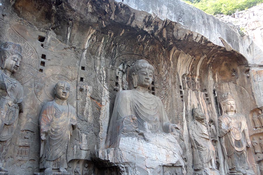 2000年世界遺産登録。河南省洛陽市に位置する洞窟寺院。敦煌の莫高窟、大同の雲岡石窟と並ぶ、中国三大石窟の一つである。494年、北魏の皇帝が洛陽に遷都したことから始まる。皇帝の仏教への信仰は厚く、次々に仏教建築を建造し、歴代の皇帝により更に拡大された。龍門石窟もその中のひとつで最も有名な石窟である。その中でも唐代、則天武后の統治時期に造られた「奉先寺石窟」が最大規模で、内部にある仏像は高さ約17メートルの高さを有し、本尊の面貌は則天武后をモデルにしたという説もある。その表情は美しく優雅で、見る者を魅了する。その他の代表的な石窟は、北魏の「古陽洞」、「賓陽洞」、「蓮花洞」と唐代の「潜渓寺」、「万仏洞」、「看経寺」などがある。