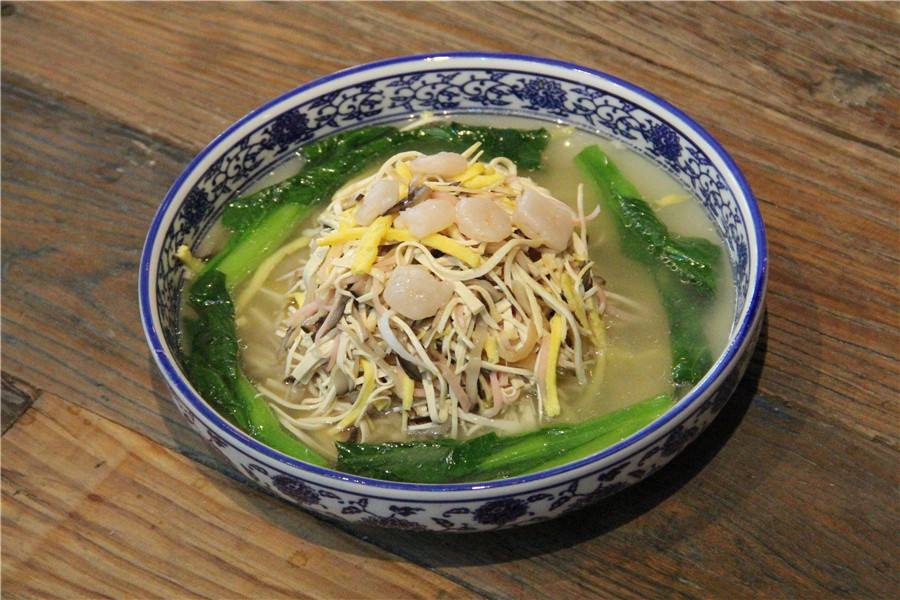 主な原料は江蘇省特産のハム、松茸、黒キクラゲ、豆腐、海老、塩、だしなどがあります。原料を細切りにし、さまざまなスープを合わせ煮、ごま油と醤油をかけて、すっきりとした味わい深いのです。