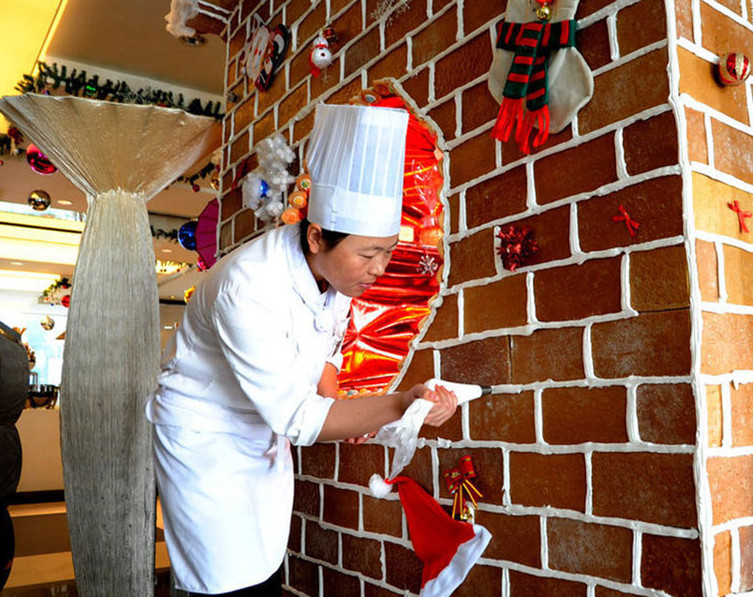 12月14日江蘇省連雲港市ではクリスマスの格好をした店員がクリスマス小屋のケーキの前で記念写真を撮っている。クリスマスが間近に迫るなか、江蘇省連雲港市にあるホテルがスタッフ30人がかりで、重量250kg 、300缶分の蜂蜜と50kg 砂糖、チョコレート、クリームなどを使って、3万元(約38万円)のクリスマス小屋を作っている。