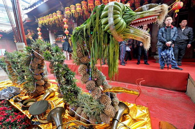 2月6日、竜年元宵の際にいろいろなフルーツで作られた数十メートルの「フルーツ竜」は福建省泉州元宵縁日に現れ、多く人々の目が引きつけられた。