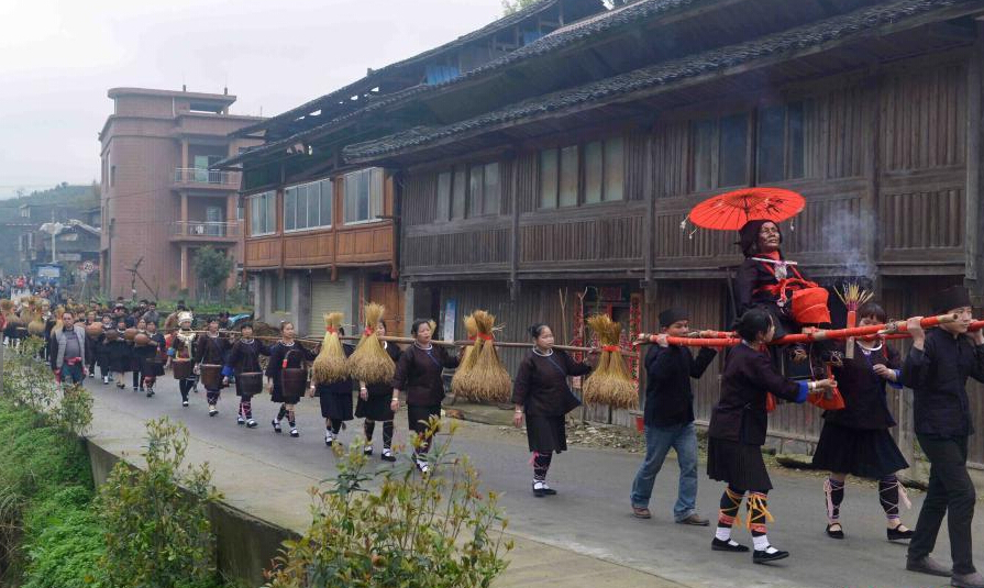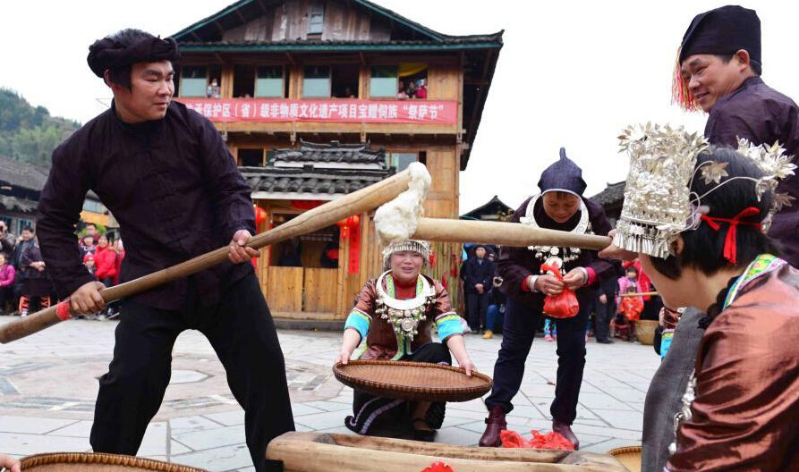 3月23日(旧暦2月25日)に、広西省桂林市龍勝県楽江卿で、トン族人が年一度に「祭薩節」を楽しく迎えた。薩壇の前で、およそ一万人の観光客と地元の人々は「多耶」を開き、歌のやりとり、蘆笙吹きなどのイベントを開催し、トン族の独特なやり方で、トン族の始祖母の「薩歳」の祭りをしている。