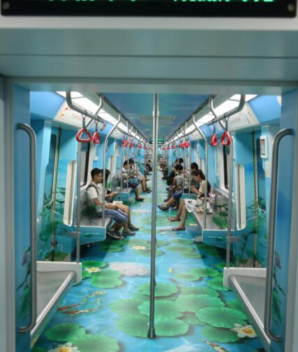 この「蓮の花印象」テーマは、オリジナル創作に二ヶ月間以上をかけ、3D色彩絵画工芸を使い、7人のスタッフによって丸4日間をかけて描き終えたという。地下鉄の中は蓮の花や蓮の葉で満たし、あまりに美しくてまるで本物のようだ。