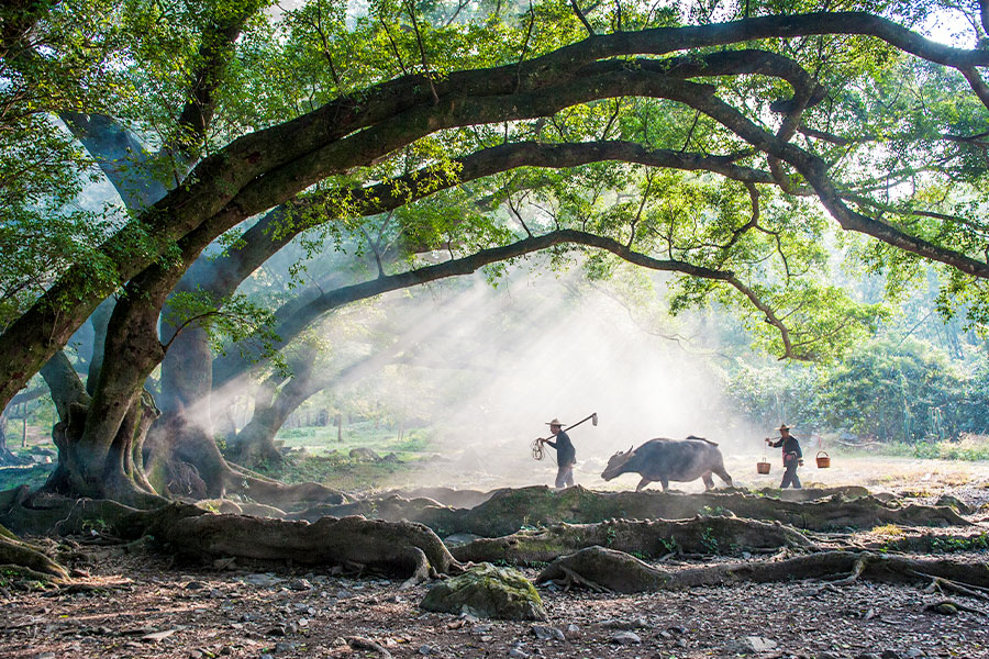 楊家渓は緯度の最北の古榕樹群と江南最大の純粋な楓の葉の林を持っています。その中で一番価値があるのは「ガジュマル王」で、樹齢は800年以上もあります。幹の周囲はおよそ12.6メートルで、冠状直径51メートルで、高さは30メートルです。木の幹の空洞には、7つの穴があります。