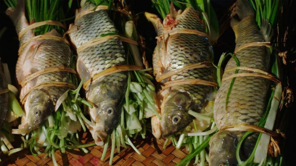 鯉を背中に沿って切り、内臓を取り除いてから、どぶろく、ねぎ、にんにく、しょうが、食塩などの薬味を振りかけ、ニラ、広菜を魚の腹に詰めます。米草でくくって、鍋に入れて蒸します。骨は脆く、肉は脂身が細かく、魚肉の味が濃いのです。