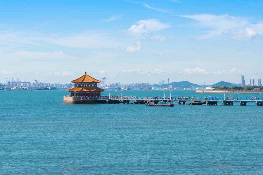 青島市南の臨海地区にある青島の象徴。清の光緒18年(1892年)から約1年かかって完成した。前海桟橋、南海桟橋、埠頭とに分けられる。全長200m、幅10m、表面は石で、橋の両側は鉄柵が備えてある。青島で最も古い軍事用人工埠頭だ。ドイツ軍に占領されてから、この桟橋は貨物用埠頭となった。