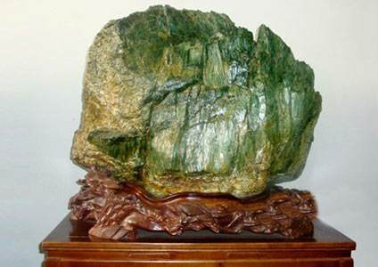 嶗山緑石は別名「海底玉」と呼ばれ、崂山東部の仰口湾で産出します。色はさまざまな深緑があり、翠色の緑石を上品とします。彫刻によって、光沢が透き通ります。崂山緑石は盆栽や装飾品によく使われます。