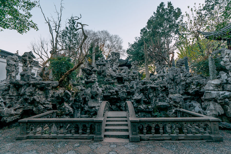 元代の至正2年(1342年)に造園された、蘇州四大名園のひとつ。太湖石で埋め尽くされた奇石庭園として知られ、その石の形が獅子に似ていたことから獅子林と名付けられた。蘇州の西に位置する太湖から採れる無数の穴の開いた石は昔から観賞用として珍重されたため、皇帝や富豪たちは、富の象徴である太湖石を競って庭園に配したという。