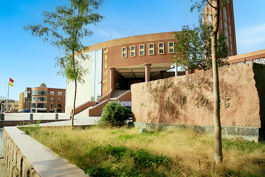 トルファン博物館はトルファン市の高昌西路に在り、1989年に落成し、敷地面積が9ムー(1ムーは666平方メートルになる)に及びます。建築面積が2000平方メートルに達する博物館はメインパビリオンと「巨犀陳列館」から構成されています。博物館は設備が完備され、近代的な安全保障施設も揃われています。また大型の透明式の密封した展示用コーナーも導入されています。これらの優れた設備に相応しいレベルの高い館内説明に勤めるスタッフも育成されています。現在、館内に所蔵するものが2387件にも上っています。国の一級とされた文物が135点あり、二級の文物が260点、三級の文物が640点あると言われています。博物館は新疆ウイグル自治区における二番目の博物館としてよく知られています。博物館は独特な建築様式でデザインされ、歴史的な厚みが感じられ、落ち着いています。西域らなではの民族風情を浮き彫りにしたうえ、濃厚な歴史的色彩も見せています。全体がそれぞれのニーズに応えるように、受付ホール、トルファン文物陳列館、ミイラ陳列館、巨犀陳列館、展覧ホール、倉庫などのいくつかの部分に区切られています。