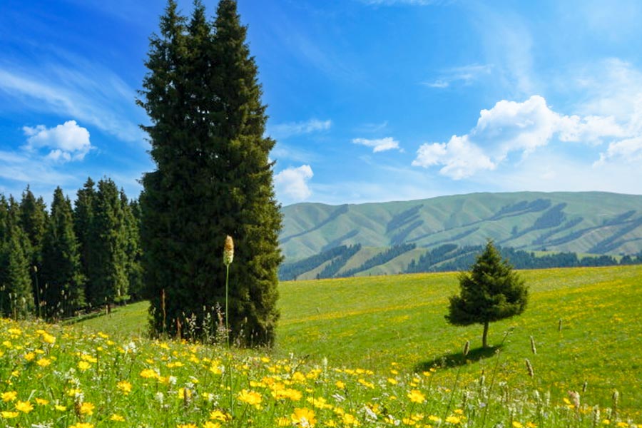 菊花台は南天山支脈である喀拉烏成山の北麓に位置しています。ここは典型的な天山草原牧場です。地理学によりますと、ここは緩やかな傾斜の沖積扇形メサという地形です。小川はメサより80-120メートル深い峡谷を蜿蜒と曲がりくねって流れています。山の南坂に雲杉は生い茂り、北坂に緑の草地が広がっています。メサの上部は平坦で幅広く、最も広い場所は500メートル、最も長い場所は6キロに達します。春と夏、メサは一面の金色の野菊花に覆われることから、菊花台と呼ばれるようになりました。