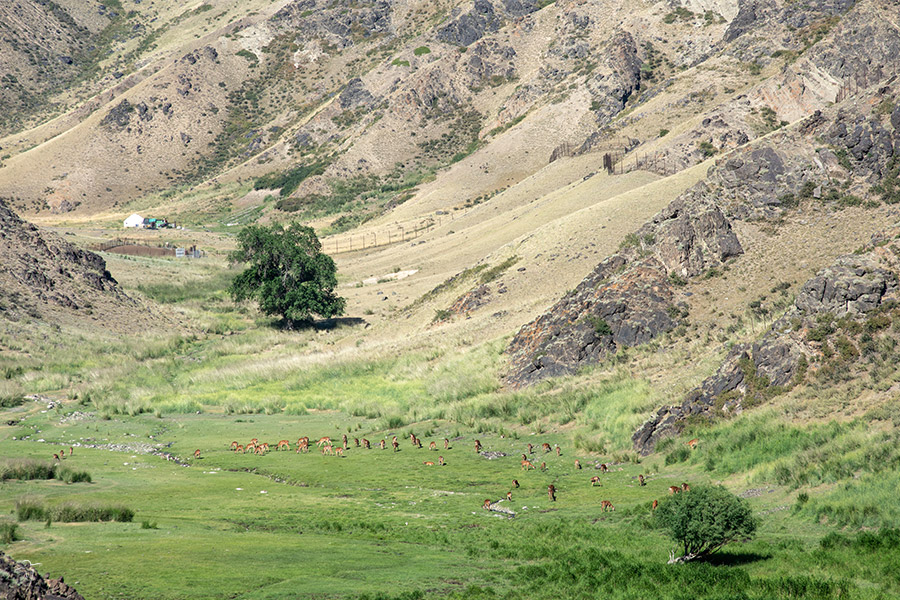 砂漠に聳えた雄大な天山はこのあたりの生命の依存する宝地と称されています。中に入ると、典型的な砂漠風景が見られます。山の前の扇形沖積平野に乾生植物はまばらに生えています。このあたりの地形は山地砂漠、山地高原、亜高山草地を揃っています。長年に流れている小川は峡谷に生命力を与え、山間草地と河穀原生林を生み出しています。