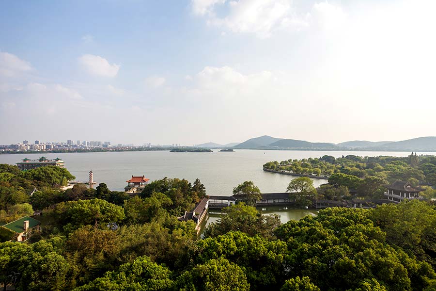 市街から鼈頭渚に向う途中にあり、太湖にある名高い江南風庭園の1つである、宝界橋の手前にある公園で、五里湖に臨み、1930年実業家の王禹卿が造った蠡園と、同じ年に建設した漁庄を建国後回廊でつなぎ、あわせて蠡園と呼んでいる、春秋時代末期、越国の功臣・范蠡が絶世の美女西施と船を浮かべたことから蠡湖とも呼ばれる。 庭園の面積は約六万平方メートルであり、千歩長廊、春秋閣、八角亭、湖心亭、凝春塔などの景観がある。 蠡園の北側には、湖濱飯店と水秀飯店が建っており、そこに宿泊するときには、朝に夕方に立ち寄りたい公園である。