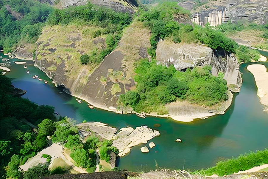 武夷山風景区の中を西から東に流れる九曲渓という山沿いに広がる景勝地。ここをいかだに乗って楽しむのが武夷山観光の目玉の一つ。出発点の星村から終点の武夷宮までは約10㎞。途中。いかだから眺める両岸の奇岩は絶景。