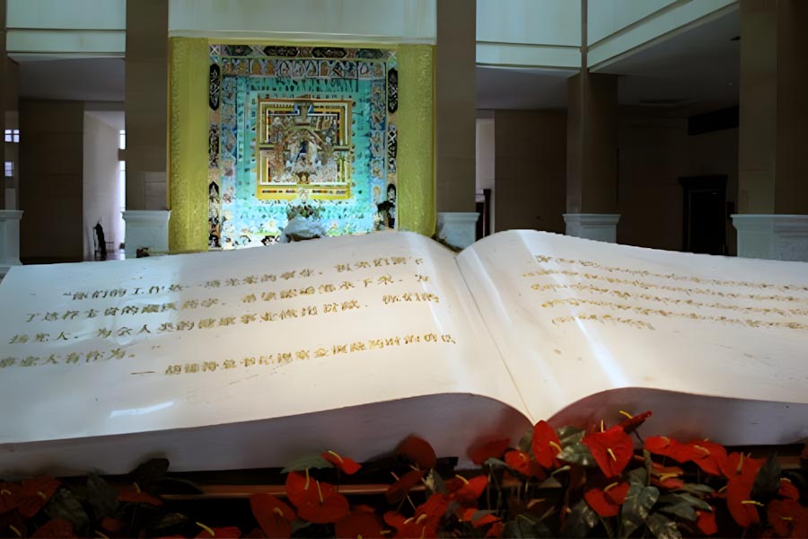 1階はチベットの歴史とイベット医学の展示エリアで、チベット医学のタンカが多数展示されている。2階には長さ618mの長大なタンカが展示されている。このタンカは企画設計に27年、製作に5年が費やされ、携わった絵師の延べ人数は400人に達するもの。ギネスブックにも載っており、チベット絵画の総決算ともいえる。タンカには、ダライ・ラマ14世を除く歴代ダライ•ラマた亡命したカルマ・カギュ派のカルマパ17世が描かれている。