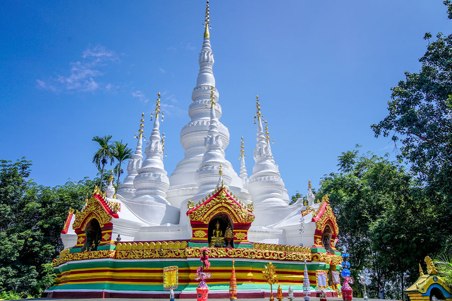 曼飛龍白塔は雲南省景洪市モウ龍鎮曼飛龍寨の後ろ側の山頂にあります。景洪市西南から60キロほど離れています。