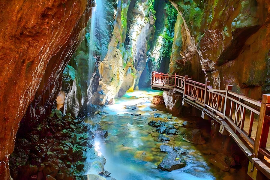 張家界市慈利県三溶村に位置しています。全長は約5キロであり、゛世界の最長の一線天゛と褒められています。垂直の落差は約200mで、地形の独特で、地域内の温度は年間に変更なく、恒温の19℃です。一番狭いどころは1m余りしかないですが、地下河の温度は約15℃です。マイナスイオンの濃度は20万個/立方センチメートルのレベルに達しており、天然のイオンバーとも言われています。